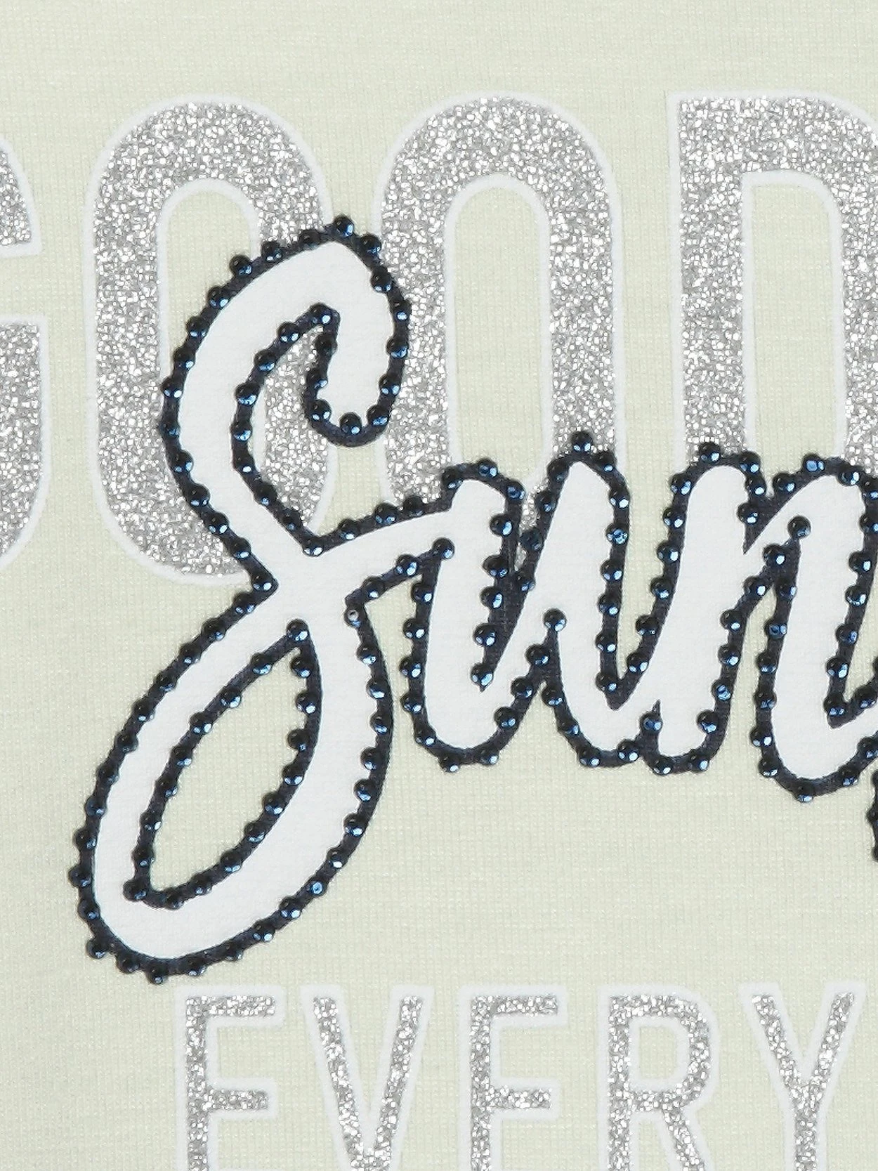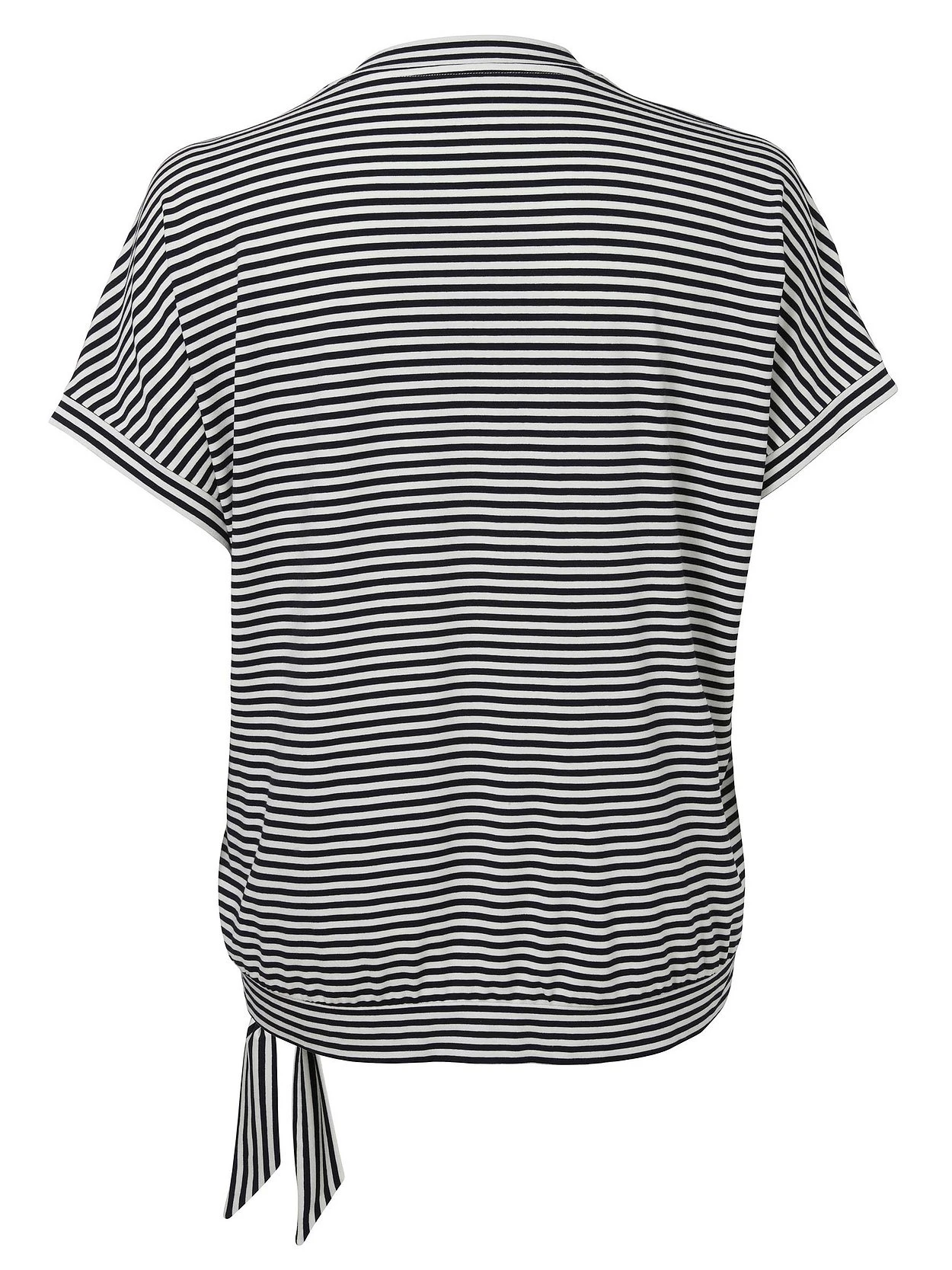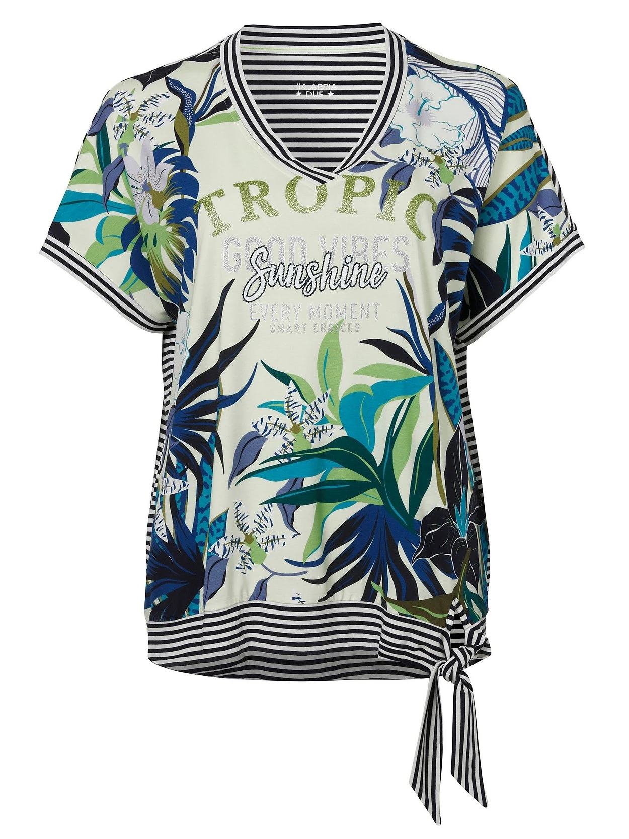 Shirt im modischen Mustermix von VIA APPIA DUE. Das Shirt ist mit V-Ausschnitt und kurzen, überschnittenen Ärmeln gearbeitet, Eyecatcher ist der seitlich geknotete Saumabschluss. Während der florale Druck und der Wordingprint vorn tropische Akzente setzen, sorgen die feinen Streifen im Rückenteil sowie an den Abschlüssen für eine sportive Note.