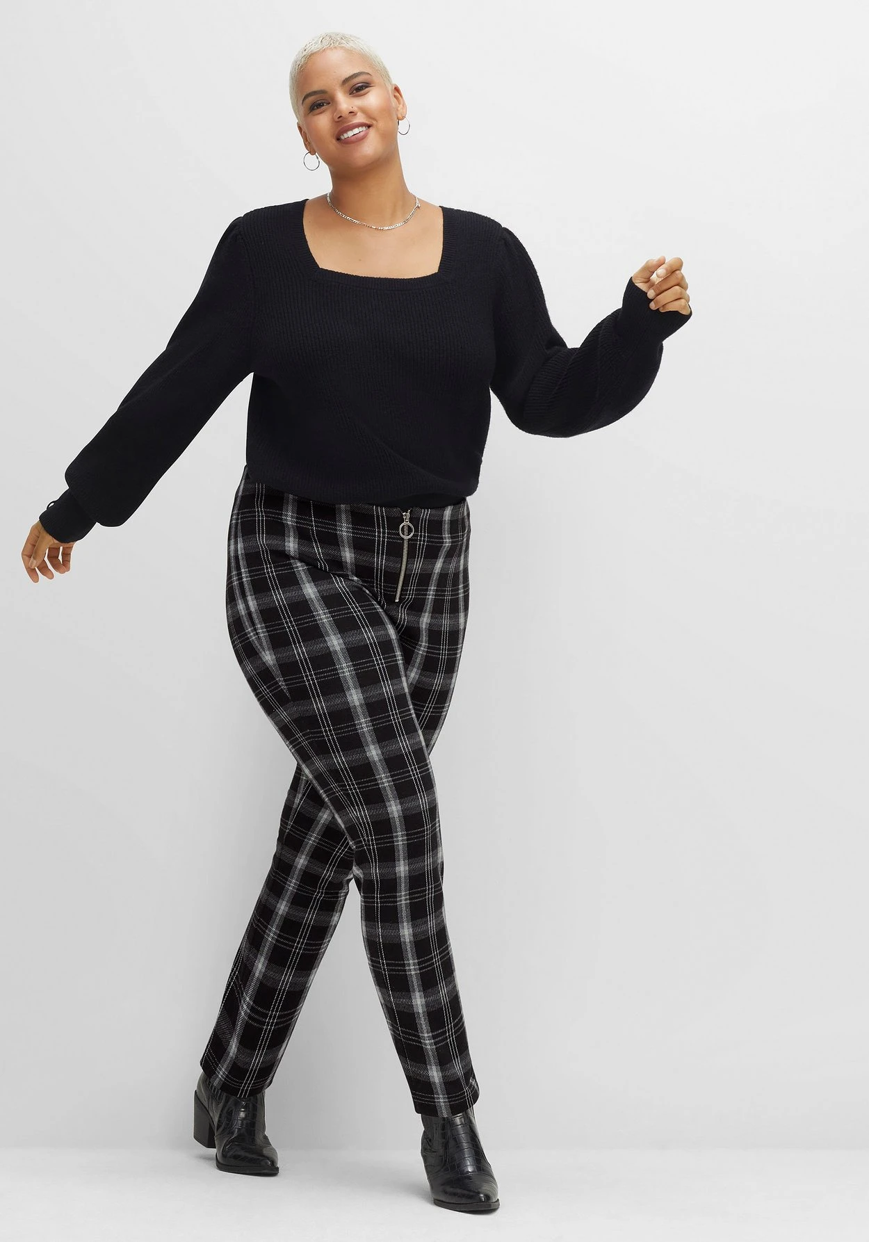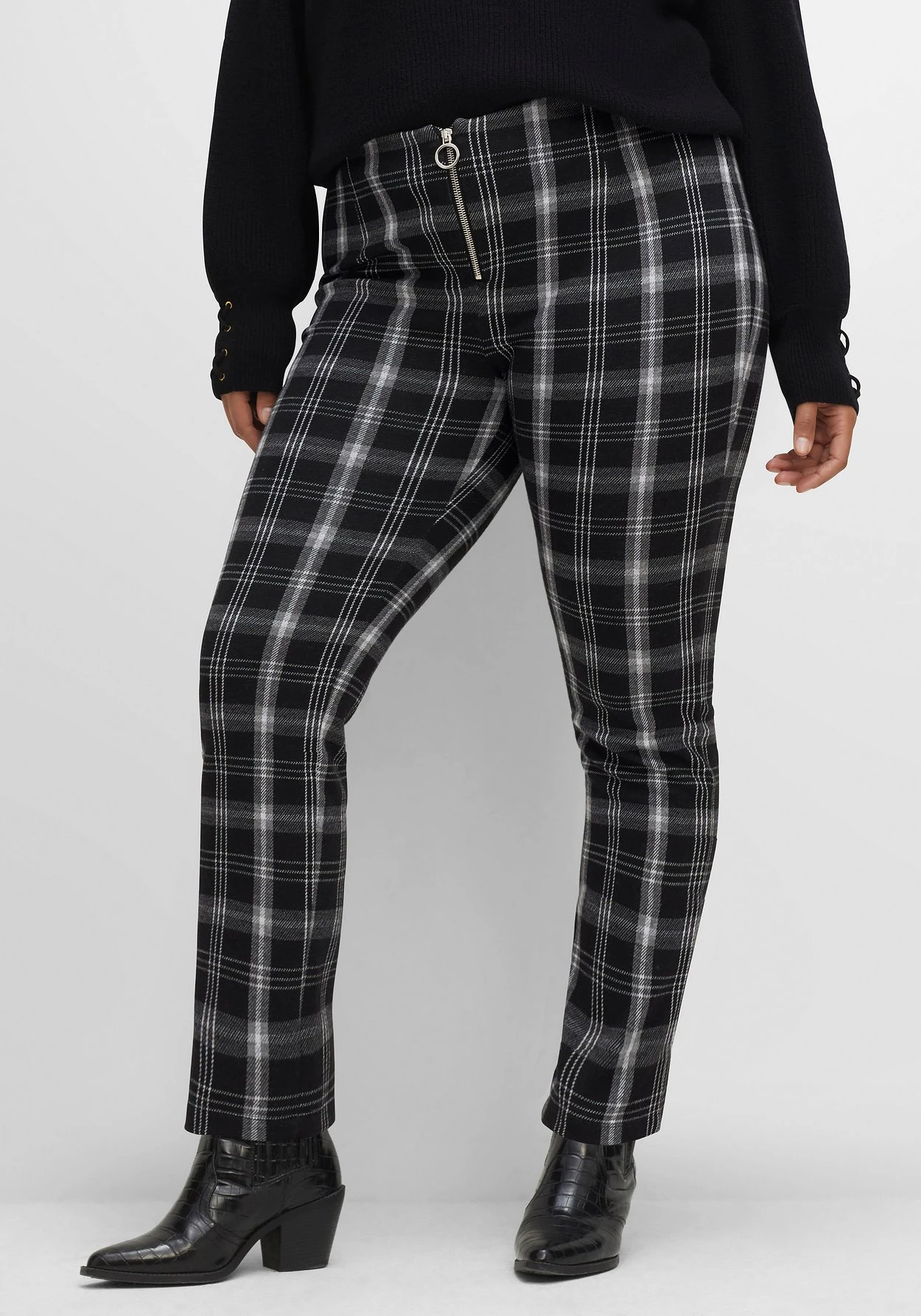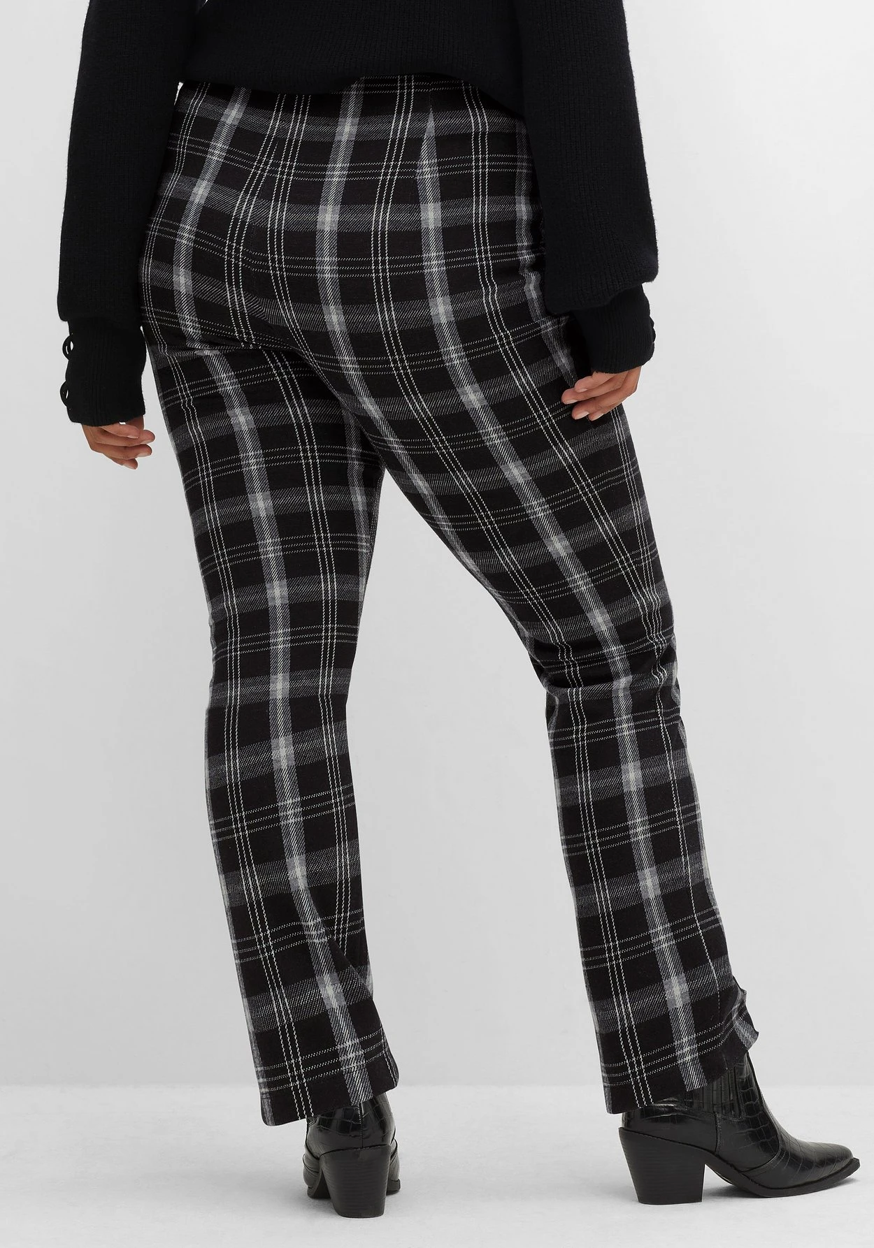 Karierte Hose von sheego by Joe Browns. Nicht nur das garngefärbte Karo-Dessin ist zeitlos, auch der bequeme elastische Bund steht auf der Beliebtheitsskala ganz oben. Der sichtbare Reißverschluss mit dekorativem Ringzipper ist praktisch und dient gleichzeitig als modisches Element. Gesichert wird der Reißverschluss zusätzlich mit einem Haken und Ösen-Verschluss.