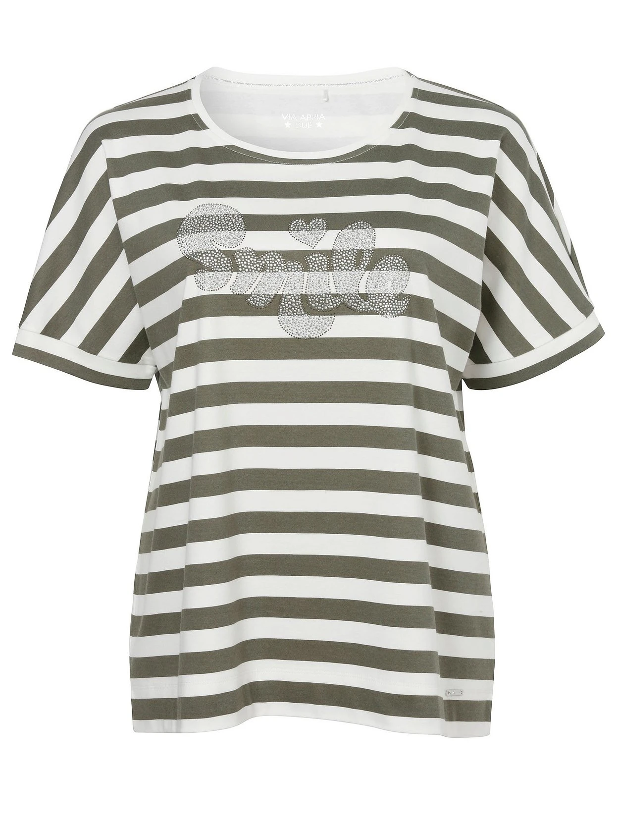 Halbarm-Sweatshirt von VIA APPIA DUE mit Streifen. Dabei setzt der Wordingprint mit vielen kleinen Strasssteinchen das Vorderteil glamourös in Szene. Überschnittene Schultern und halblange Ärmel runden den Style lässig ab.