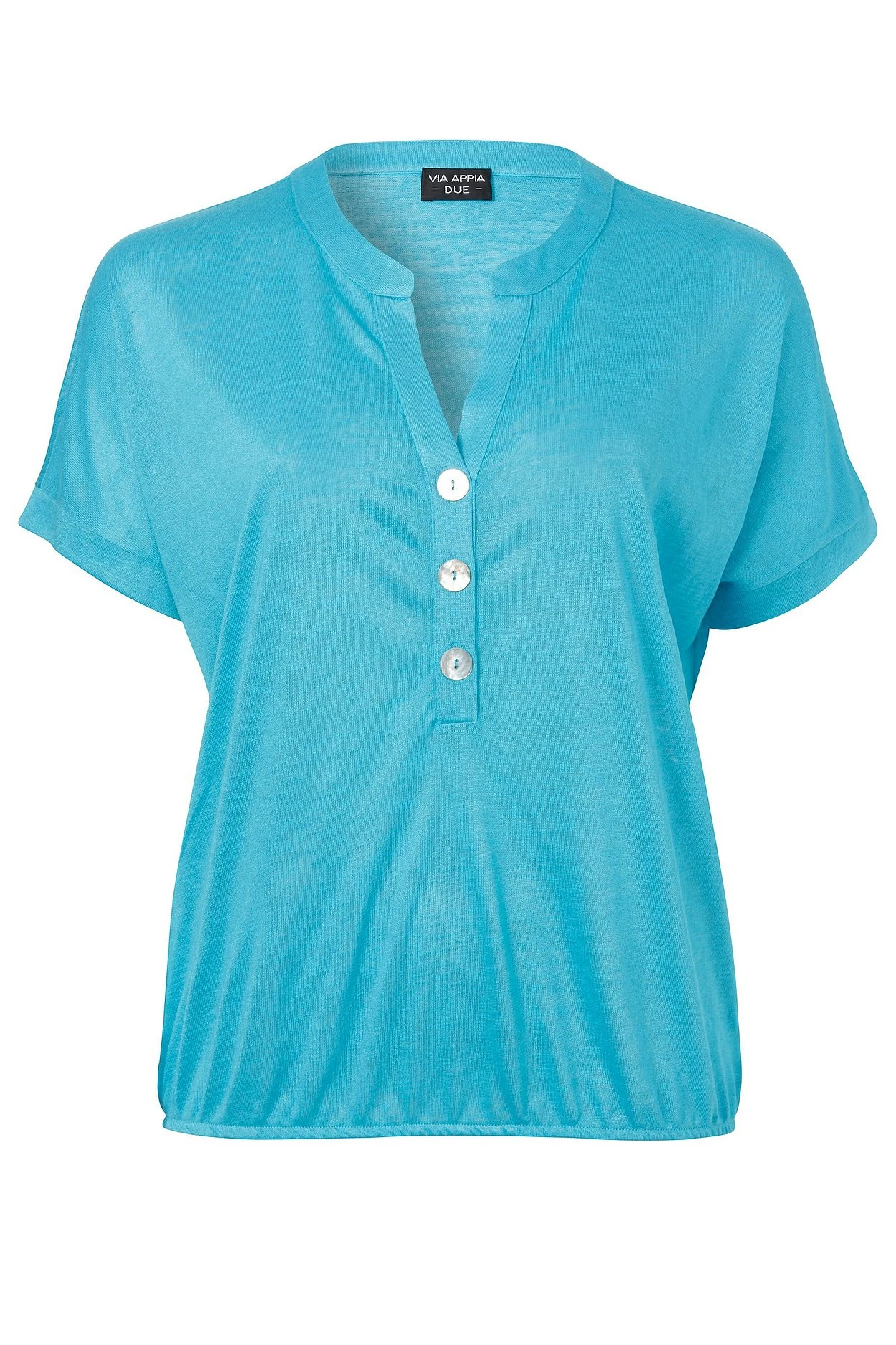Shirt in feiner Melangeoptik von VIA APPIA DUE. Der lässige Style fällt schön locker, ein Gummizugbund am Saum ist dabei ein sportives Finish. Feminine Details sind der V-Schlitz am Rundhals sowie die perlmuttfarbenen Knöpfe an der kurzen Knopfleiste.