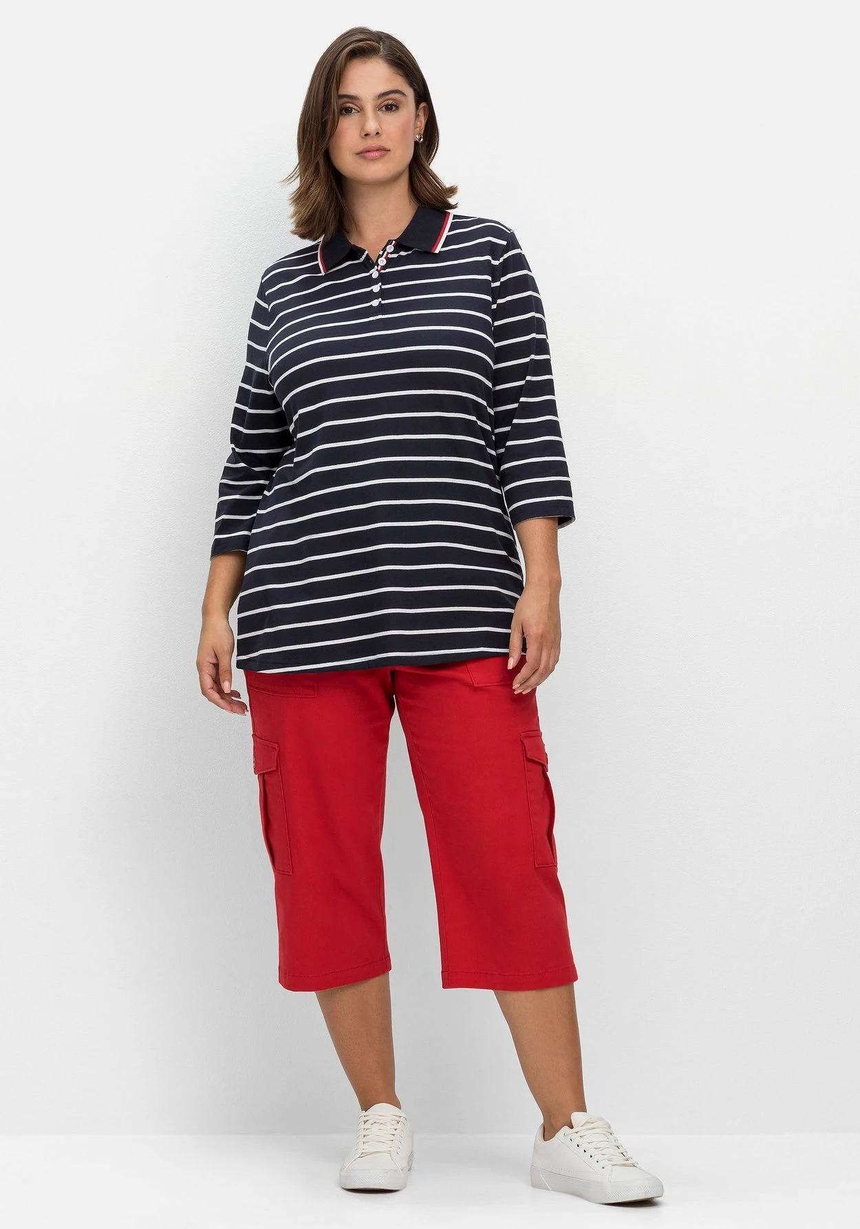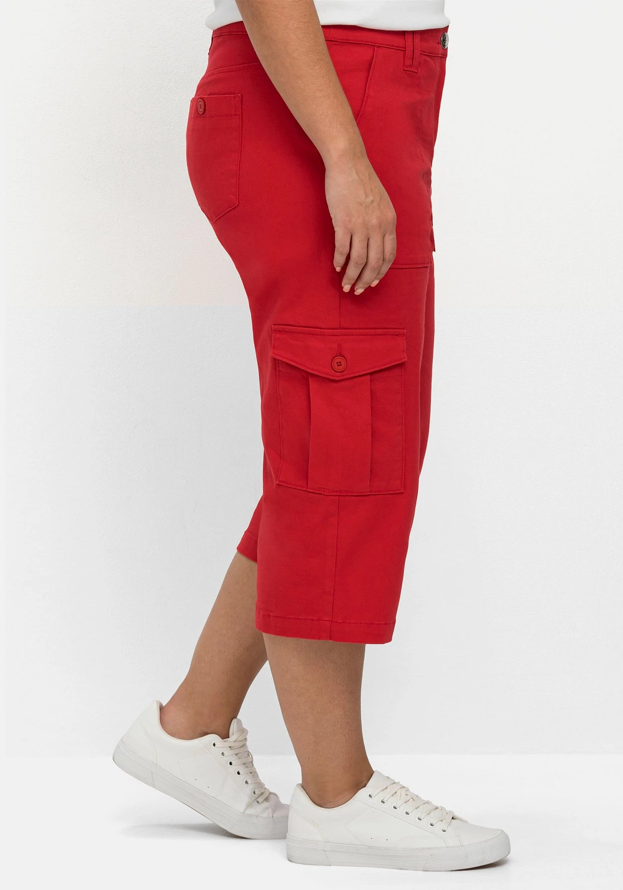 Cargo-Hose in 3/4-Länge. Für den markantem Look sorgen die auf den Oberschenkel aufgesetzten Pattentaschen. Praktisch sind die beiden großen Eingrifftaschen, am Po besitzt die Hose zwei weitere aufgesetzte Taschen mit Knöpfen. Gürtelschlaufen laden zum Kombinieren mit dem Lieblingsgürtel ein. Eine streckende Passe befindet sich hinten.