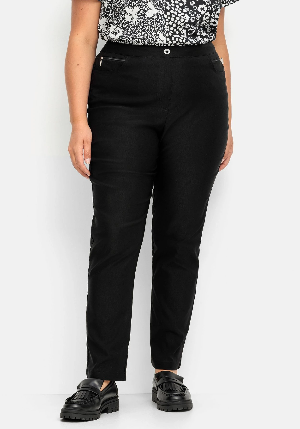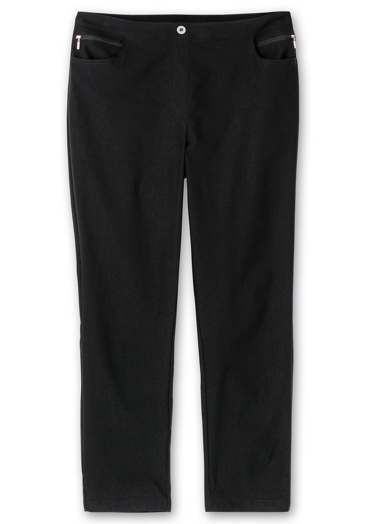 Bengalinhose in elastischer Qualität. Die Schlupfhose ist hinten am Bund mit elastischen Einsätzen gearbeitet und lässt sich dadurch bequem an- und ausziehen. Der Zierknopf und die imitierte Reißverschlussblende verleihen ihr eine gepflegte Optik. Vorn besitzt sie zwei abgerundete Eingrifftaschen, schmückende Zierreißverschlüsse dienen als modische Details.