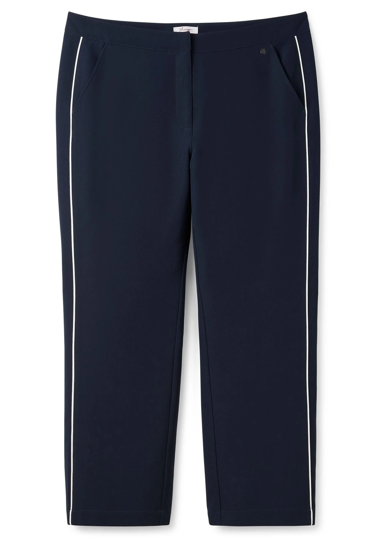 Gerade geschnittene Hose. Sportives Detail ist das kontrastfarbene Piping seitlich am Bein. Die Hose besitzt eine vorverlegte Seitennaht sowie einen klassischen Formbund und Eingrifftaschen.