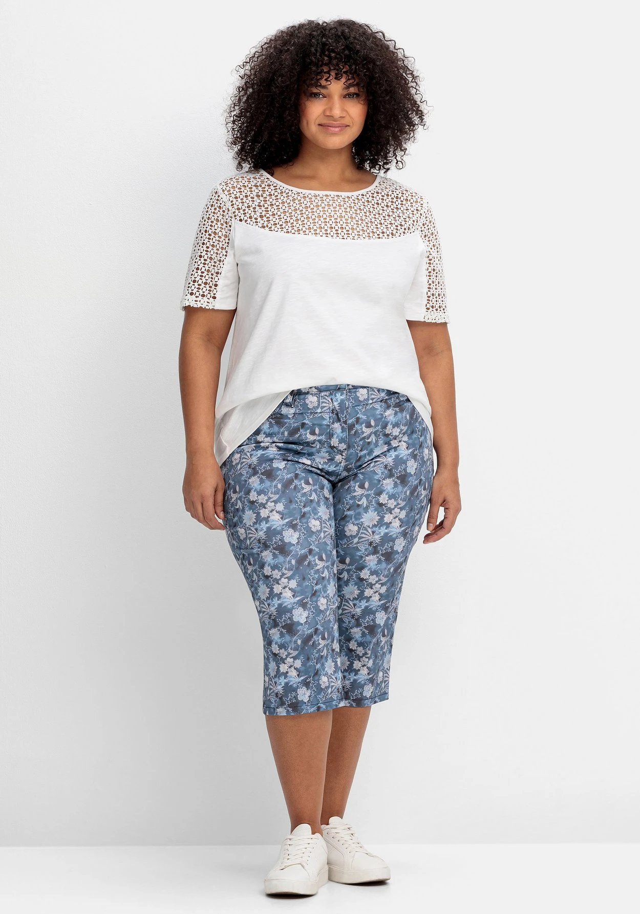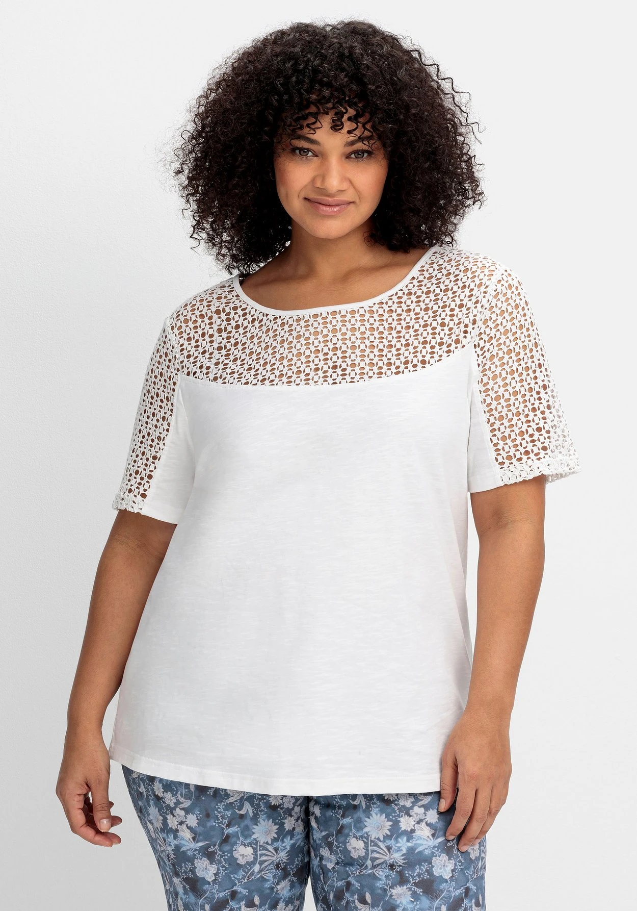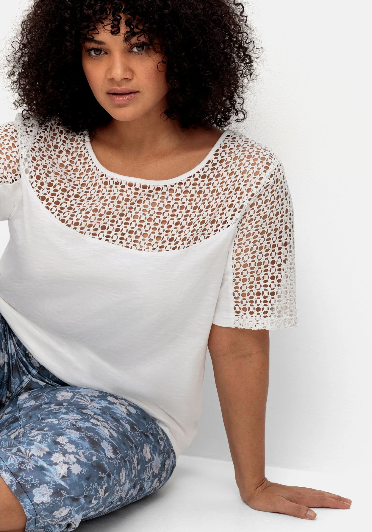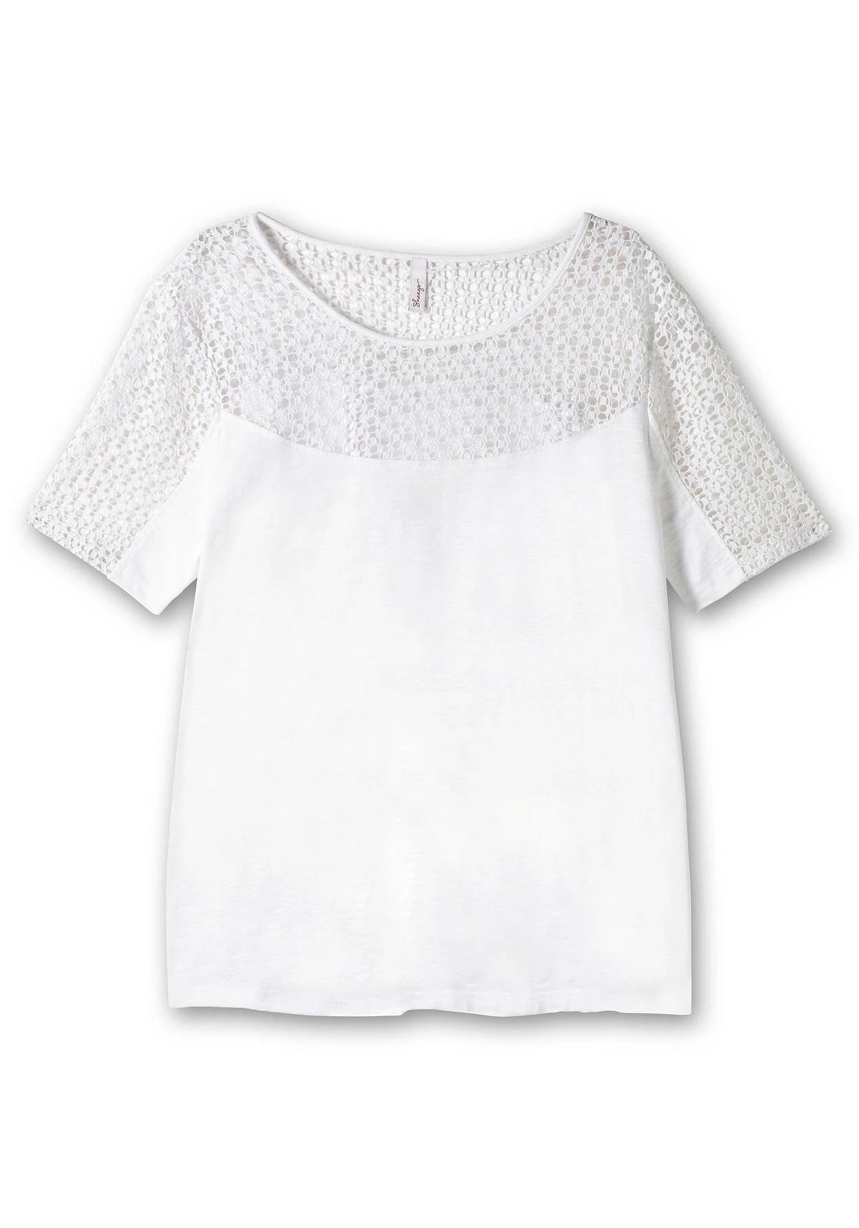 Shirt im Mix aus Flammgarn und Spitze. Unterhalb des Rundhalsausschnittes bis über den verlängerten Halbarm ist das Oberteil aus Baumwollspitze gearbeitet. Sie lässt zart die Haut durchschimmern und sorgt so für eine sommerliche, feminine Optik.