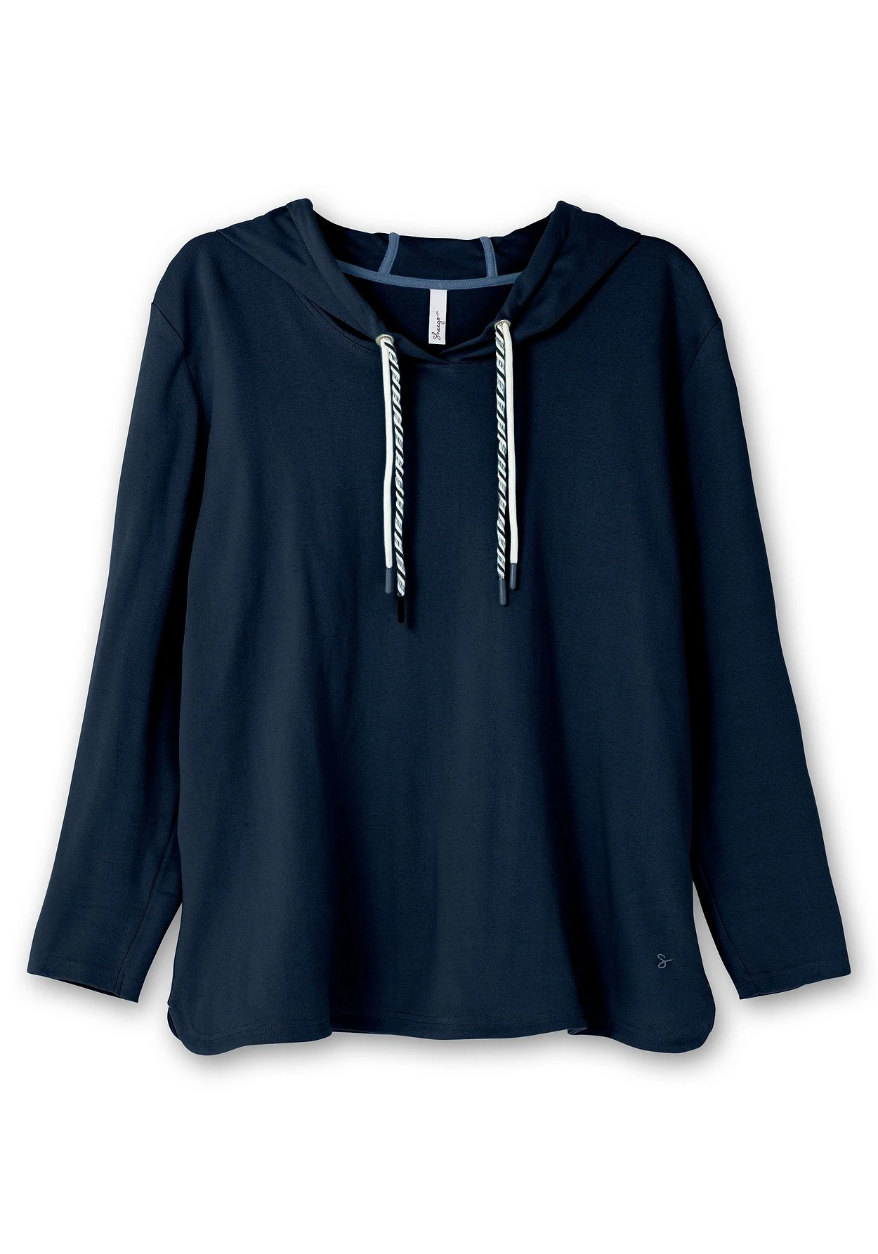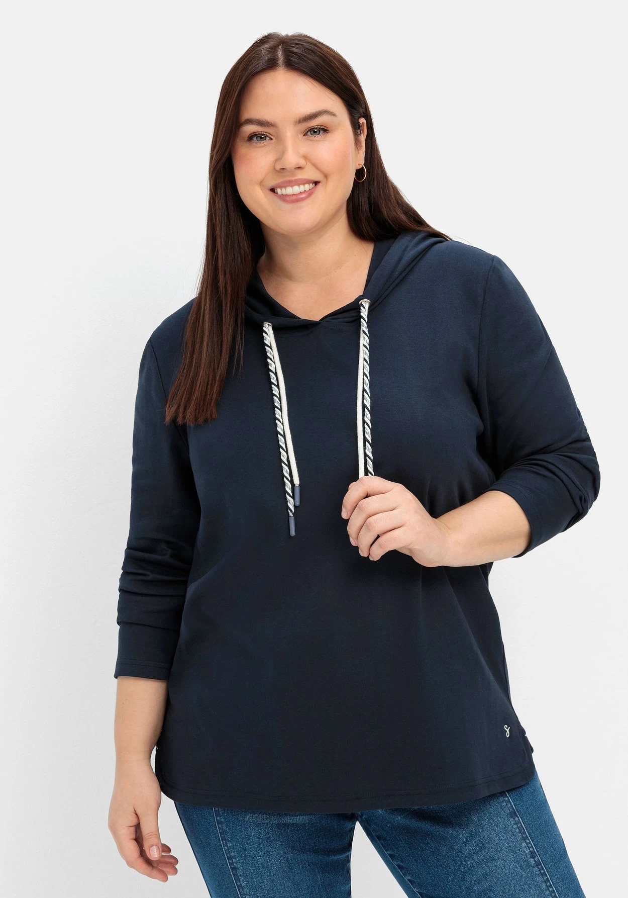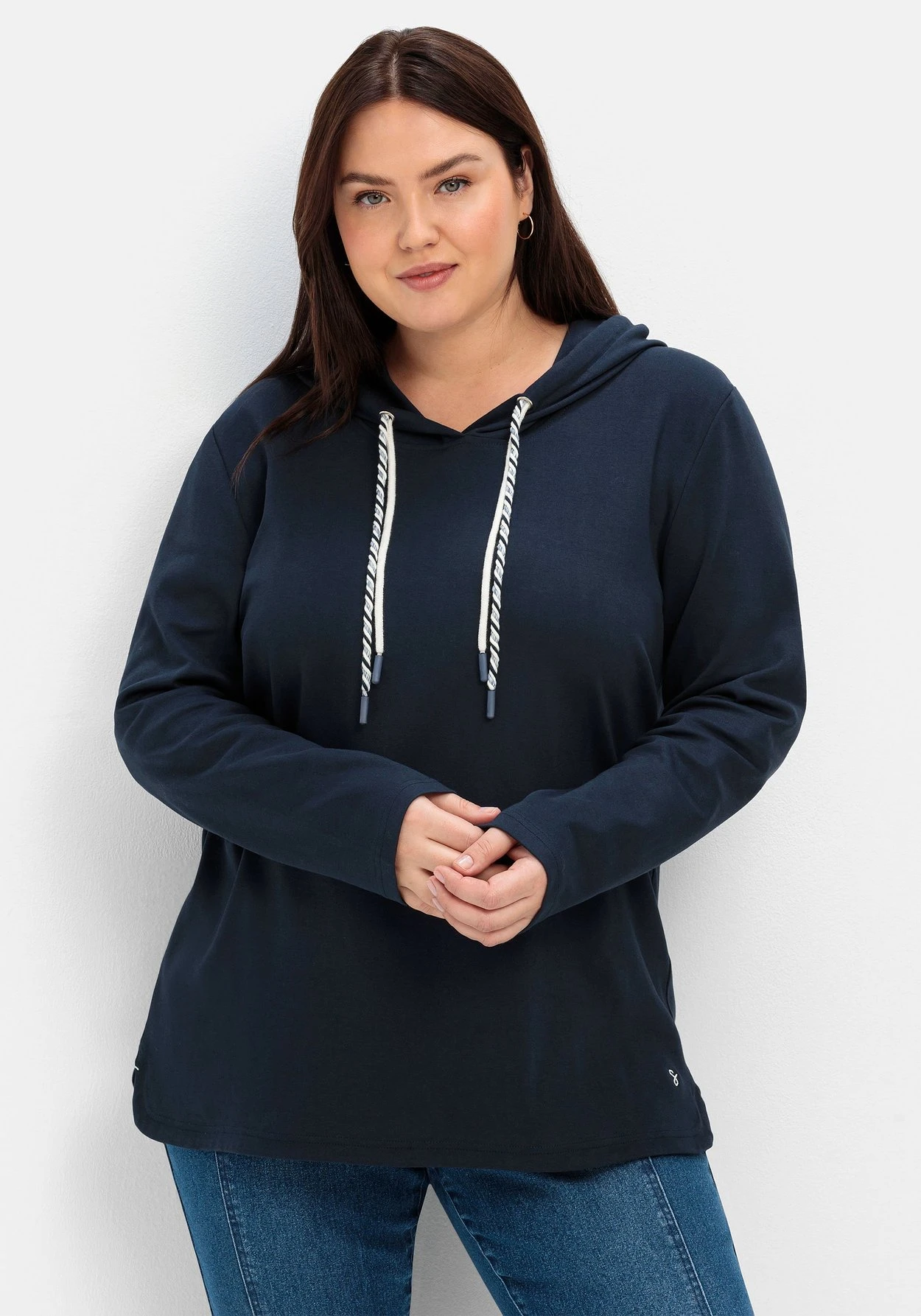Sweatshirt mit Kapuze. Charmanter Blickfang sind die Kapuzenbänder, von denen eines unifarben und eines geringelt gearbeitet ist. Das Sweatshirt besitzt einen Rundhalsausschnitt und lange Ärmel. Der leicht gerundete Saum fällt durch die Seitenschlitze angenehm locker über die Hüfte.