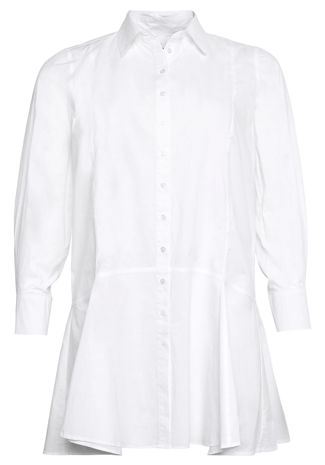 Longbluse mit ausgestelltem Saum. Die klassischen Details wie der Hemdkragen, die durchgehende Knopfleiste und die breiten Manschetten am Ärmel verleihen ihr den klassisch-eleganten Look. Für femininen Schwung und das gewisse Extra sorgt der Saum, der ab der Teilungsnaht ausgestellt verläuft. Besonders figurschmeichelnd ist die verlängerte Rückpartie, die locker über den Po fällt und optisch die Silhouette streckt. Wiener Nähte vorn und die Rückenpasse lassen die Bluse perfekt sitzen.