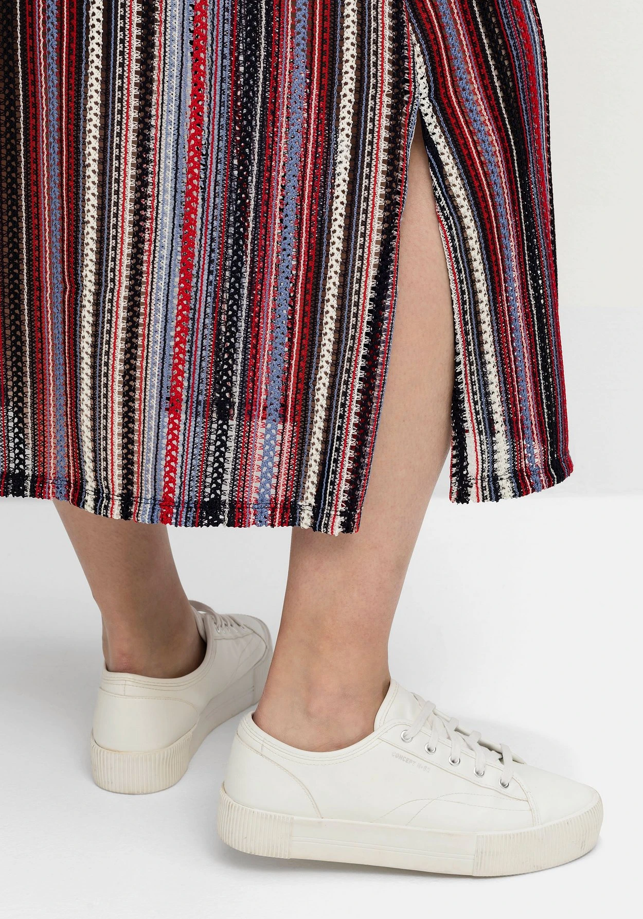 Allover gestreiftes Maxikleid. Das gewickelte Oberteil lässt einen femininen V-Ausschnitt entstehen, das Rockteil fällt leicht ausgestellt und ist mit Schlitzen dekoriert. Ergänzt wird der raffinierte Style durch ein Unterkleid mit verstellbaren Trägern.