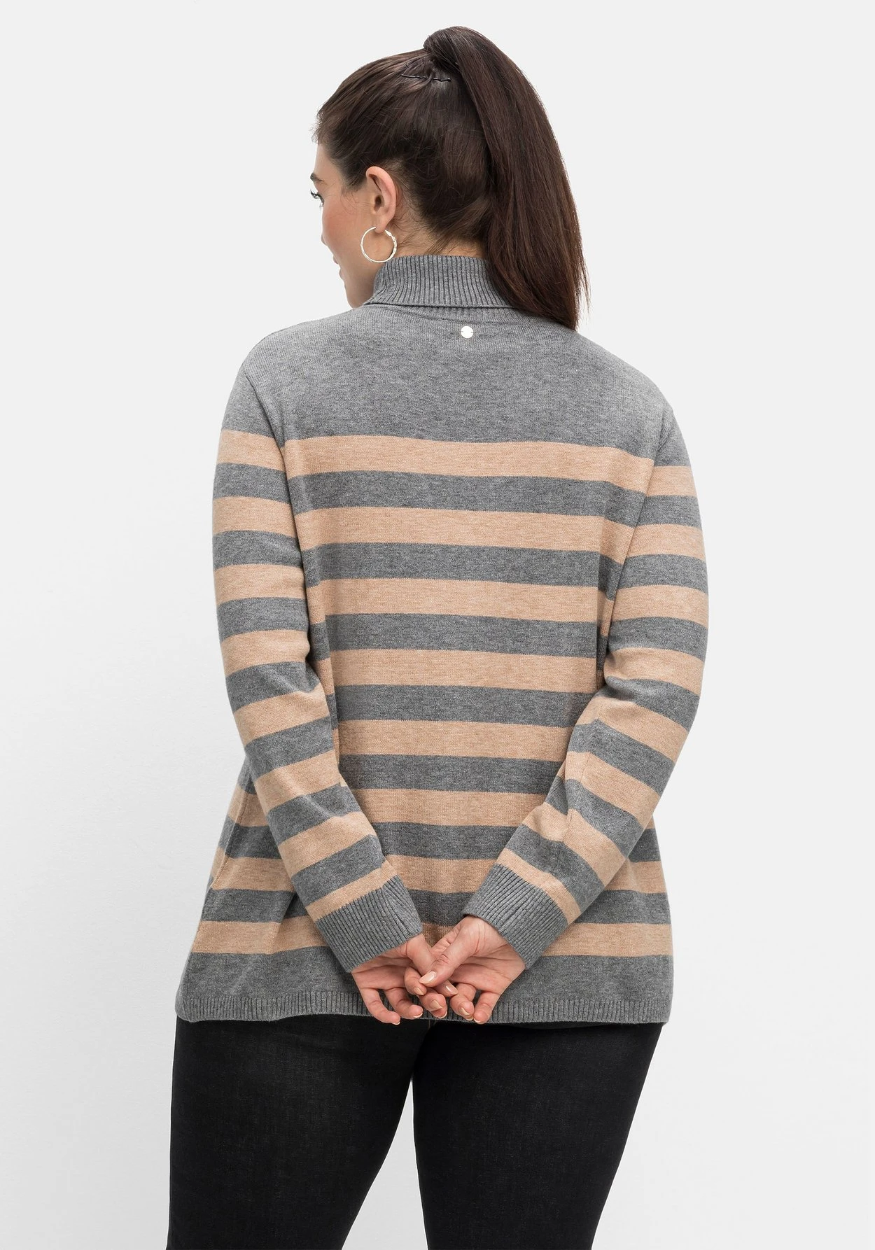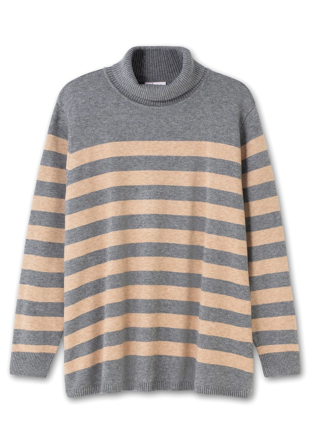 Pullover mit Streifen. Dabei setzen sich die Schulterpartien und der Rollkragen unifarben ab. Gerippte, breite Bündchen an allen Abschlüssen geben dem Pulli mehr Lässigkeit.