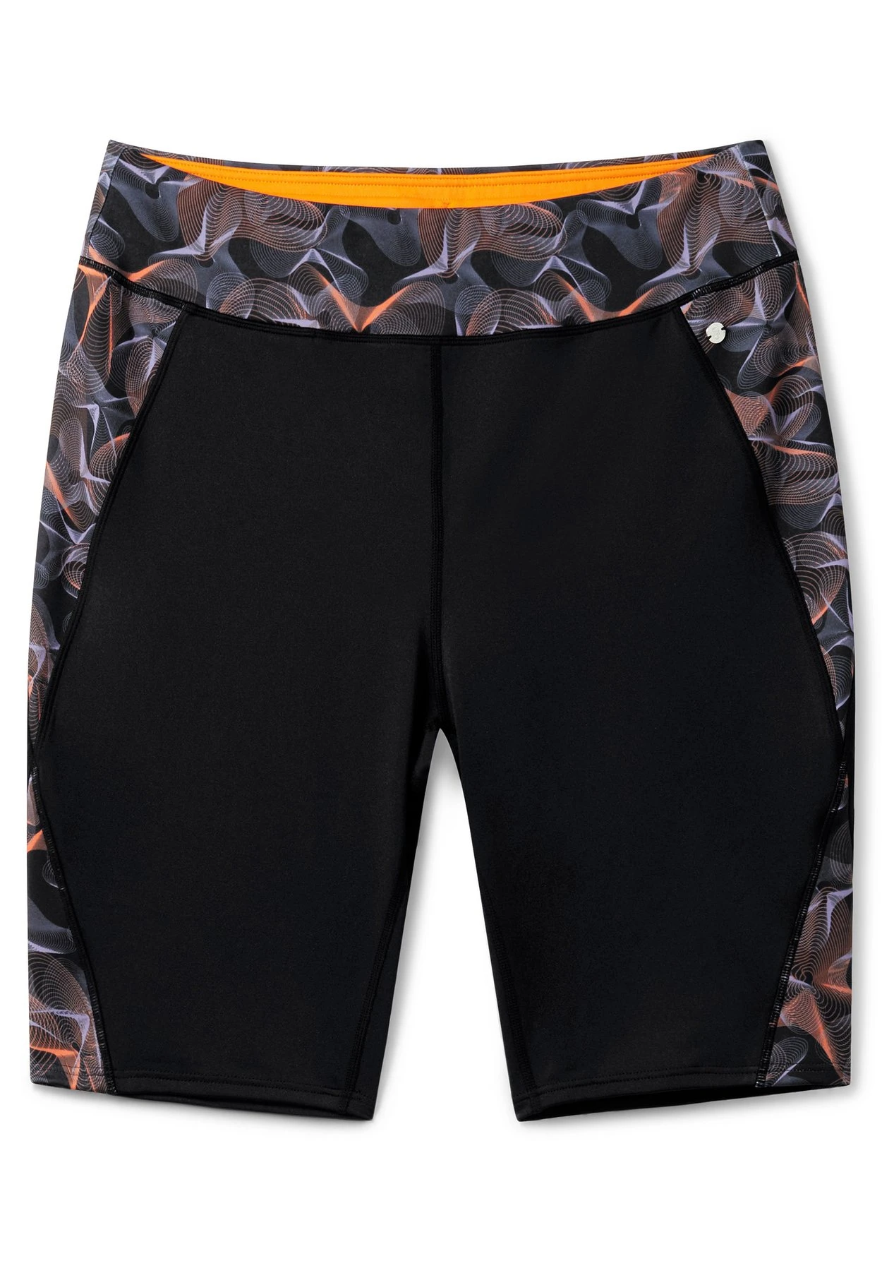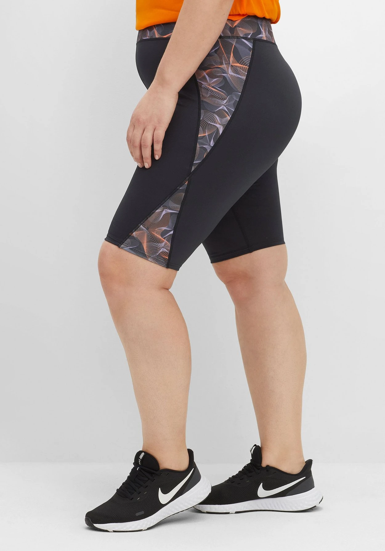 Radlerhose aus Funktionsmaterial. Für eine moderne Optik sorgt der sportive Druck am Bund sowie an den Seiten, der gleichzeitig geschickt die Silhouette formt. Mit Hilfe des innenliegenden Bändchens lässt sich der Bund in der Weite regulieren. Besonders praktisch ist die kleine Innentasche, in der Schlüssel und ähnliches sicher aufbewahrt werden können. Als sportives Finish dient der reflektierende Logodruck hinten am Bund. Unser Tipp: Diese Hose lässt sich wunderbar mit anderen Teilen aus der sheego Sportkollektion kombinieren.