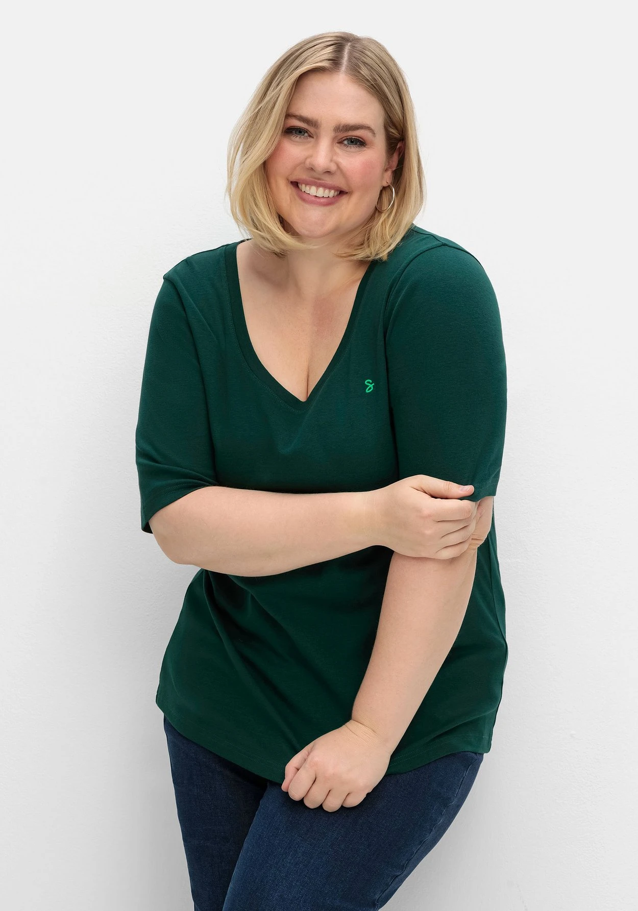 T-Shirt mit verlängertem Halbarm. Das Shirt ist mit Rundhalsausschnitt und kleiner Logostickerei vorn gearbeitet, hinten schmückt ein dezentes Metalllabel den Nackenbereich. Verlängerte Halbarme schmeicheln den Oberarmen, der etwas längere Schnitt reicht bis über die Po-Partie.