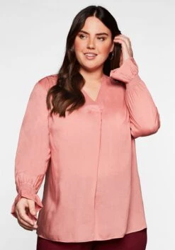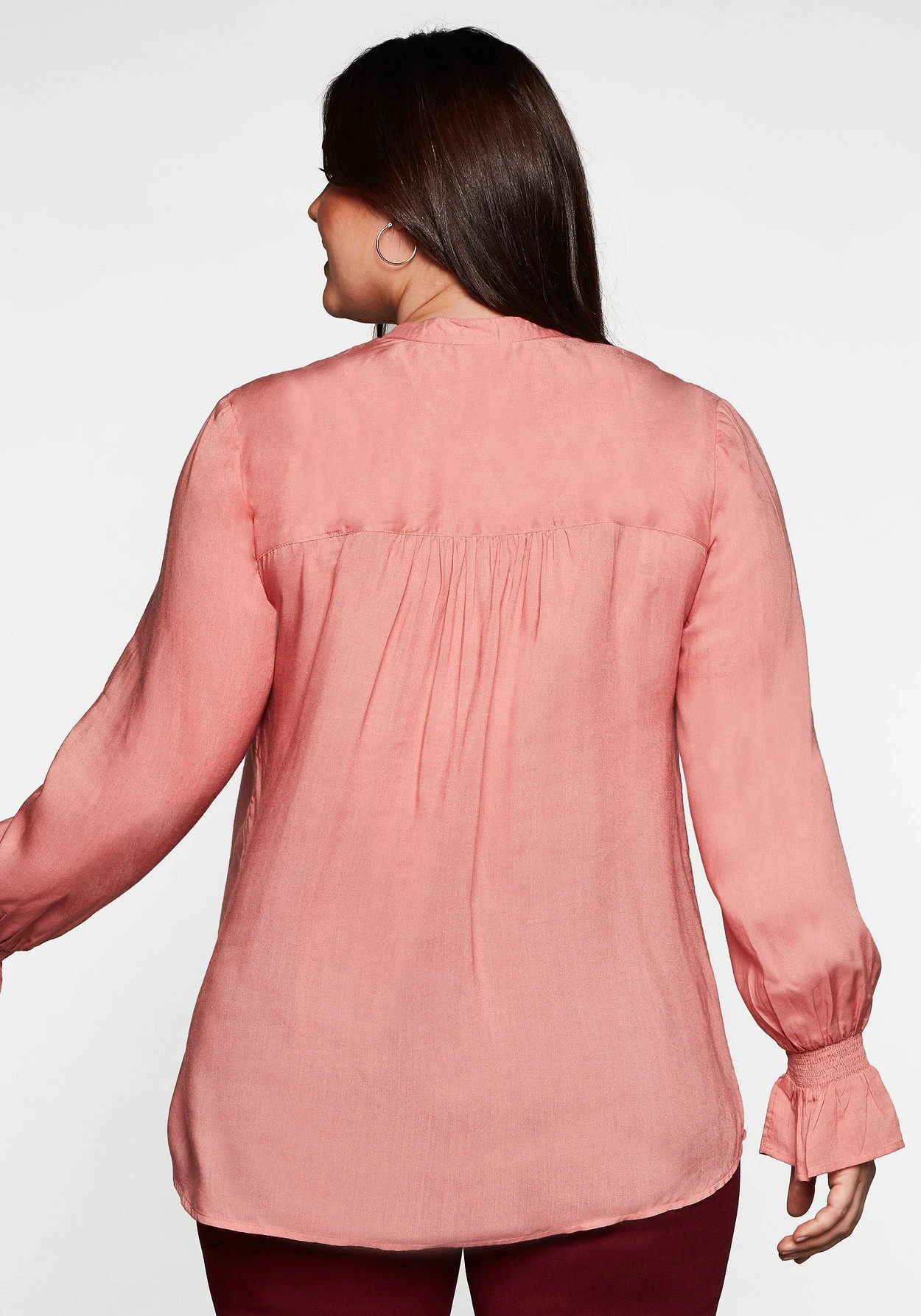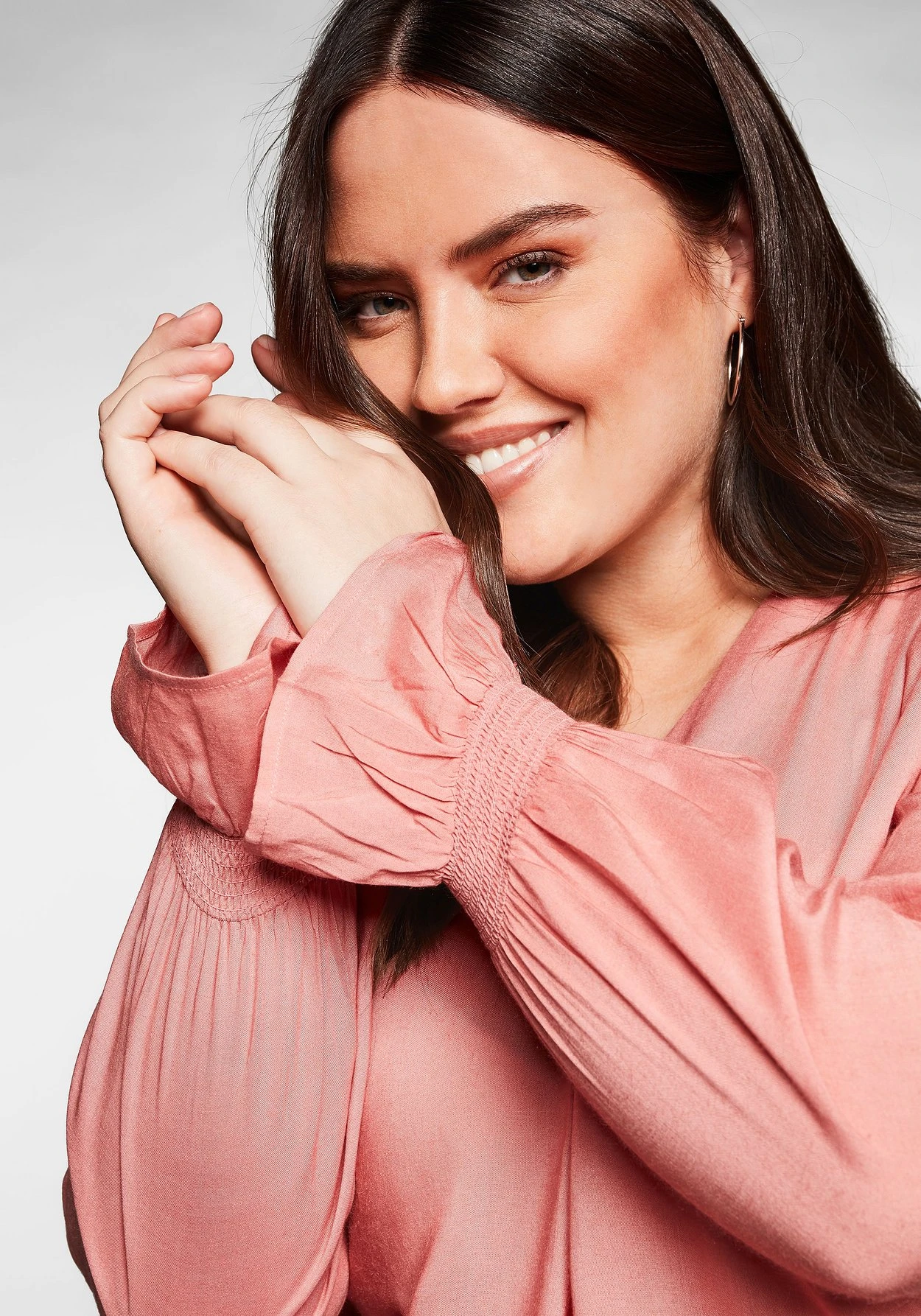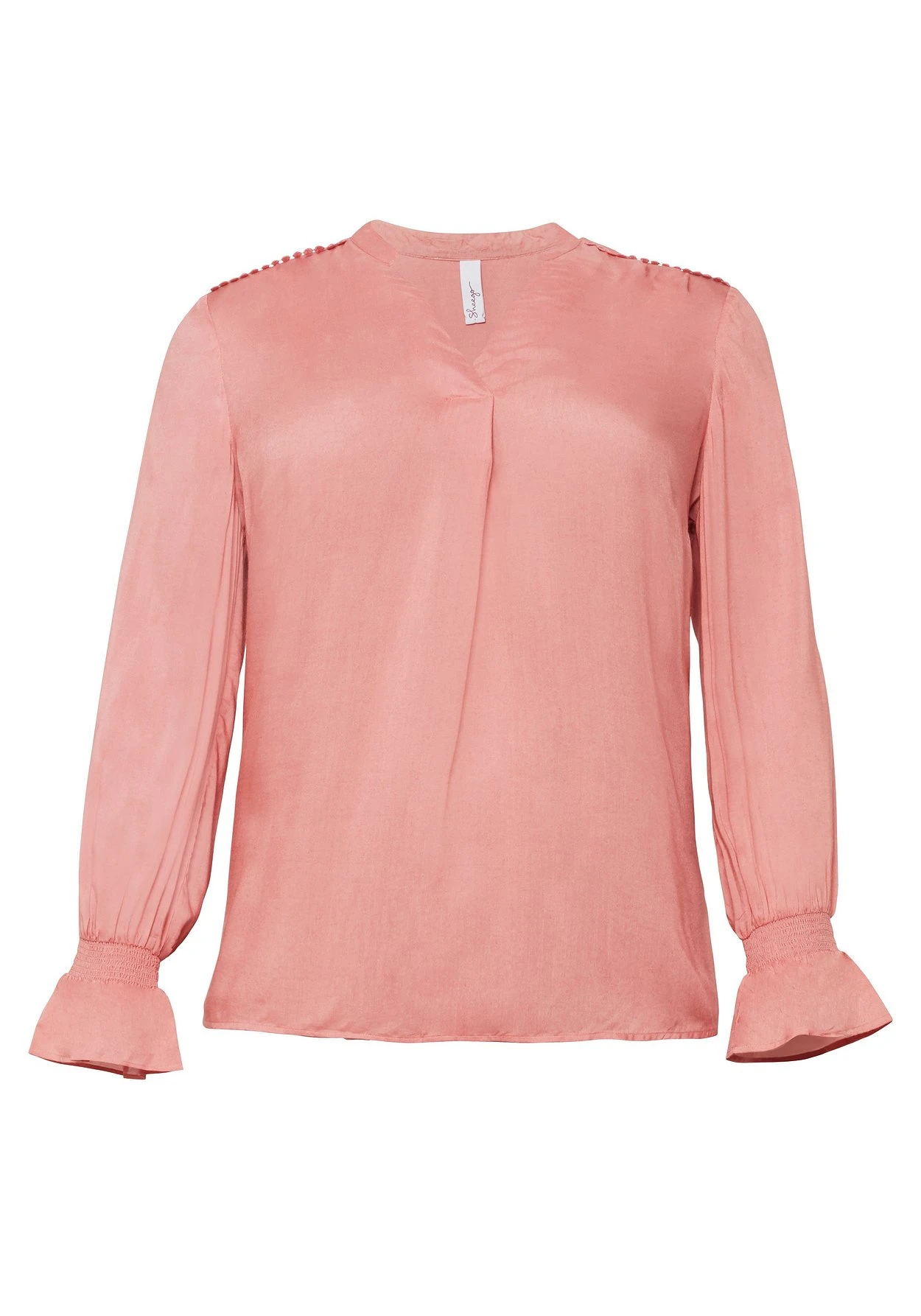 Tunika mit seidigem Glanz. Am Ärmelsaum fallen die Smokbündchen und Volants ins Auge, die vorverlegte Schulternaht erhält durch das Ajour-Tape und die gelegten Falten eine verspielte Optik. Der Rundhalsausschnitt geht in einen V-förmigen Schlitz und eine Zierfalte über, auch die Rückenpartie schmücken dekorative Details.