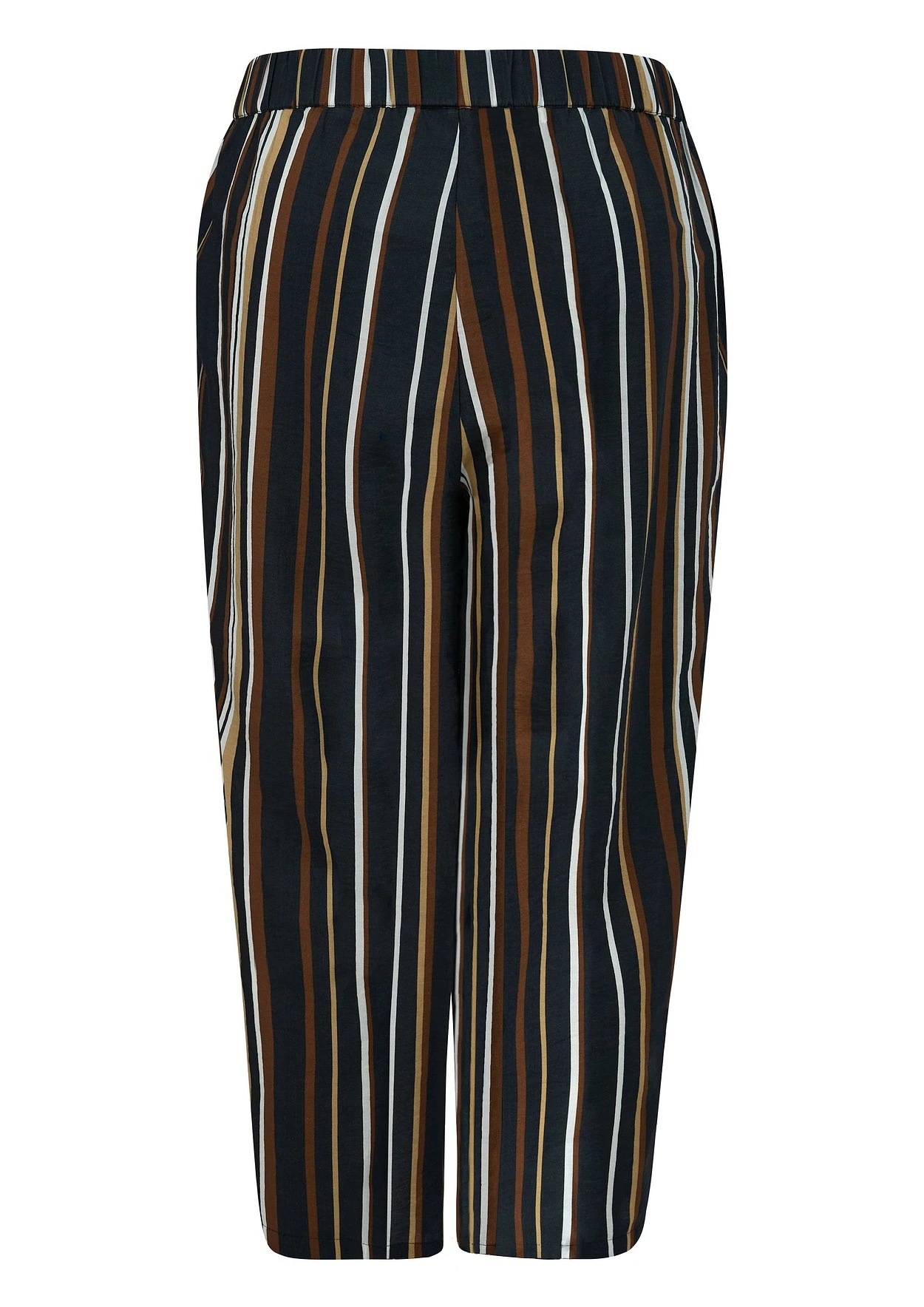 Die Hose ist in weiter Culotte-Beinform geschnitten. Sie hat eine 7/8-Länge und besitzt einen hohen Bund.
