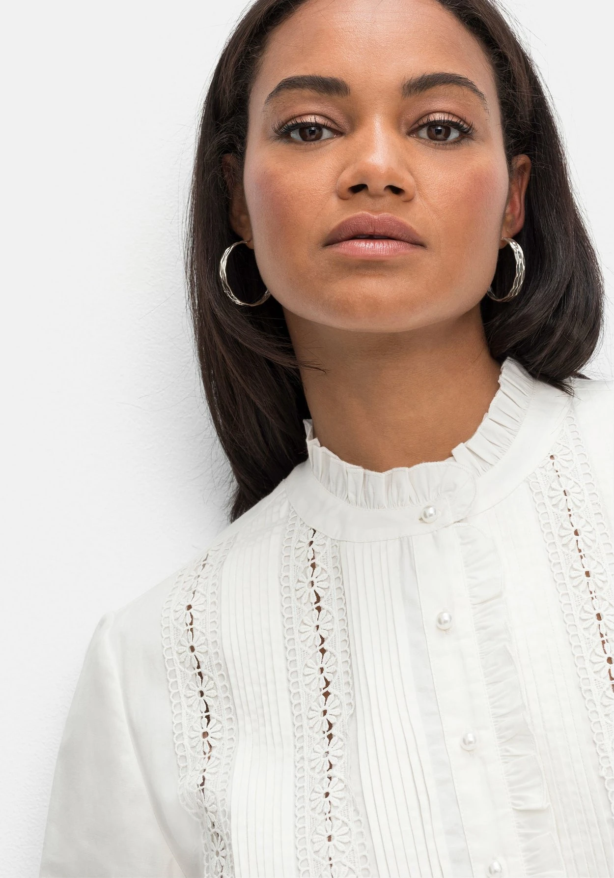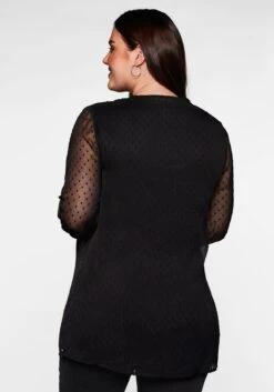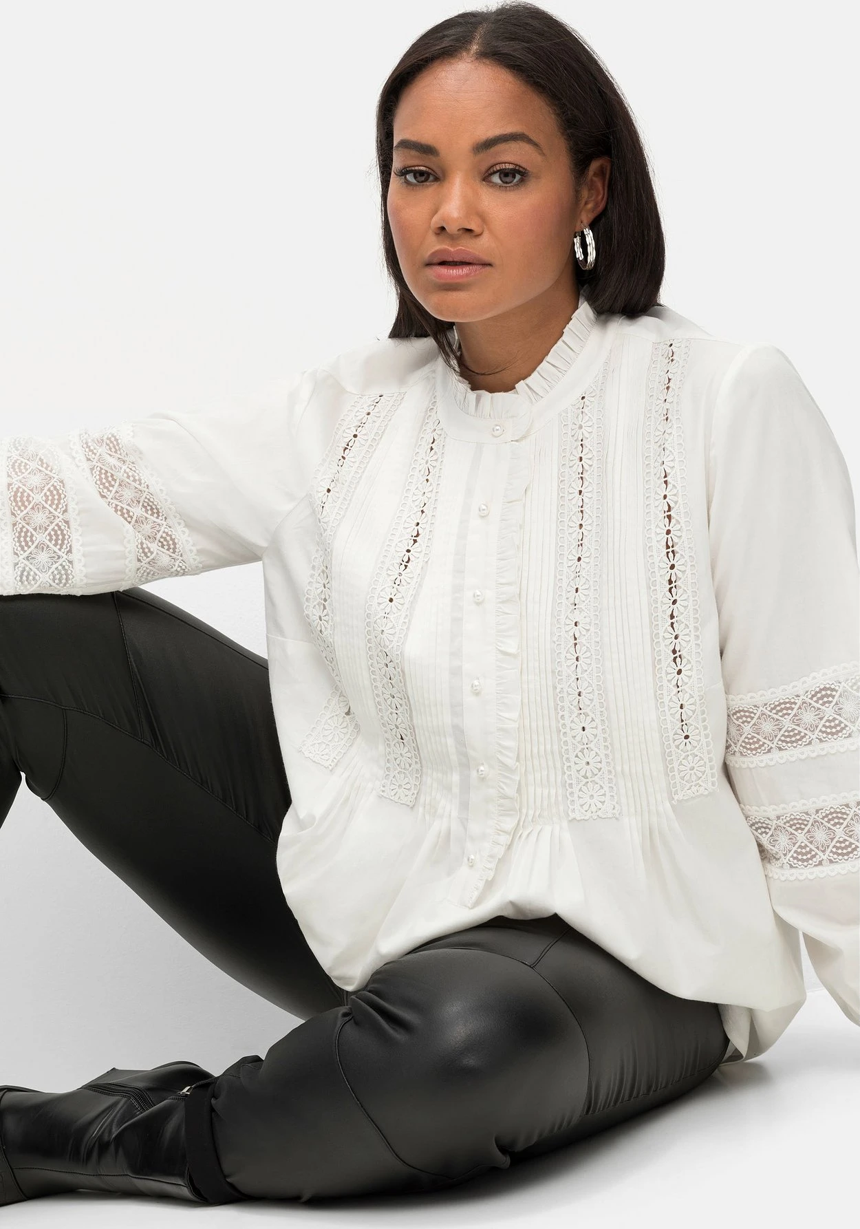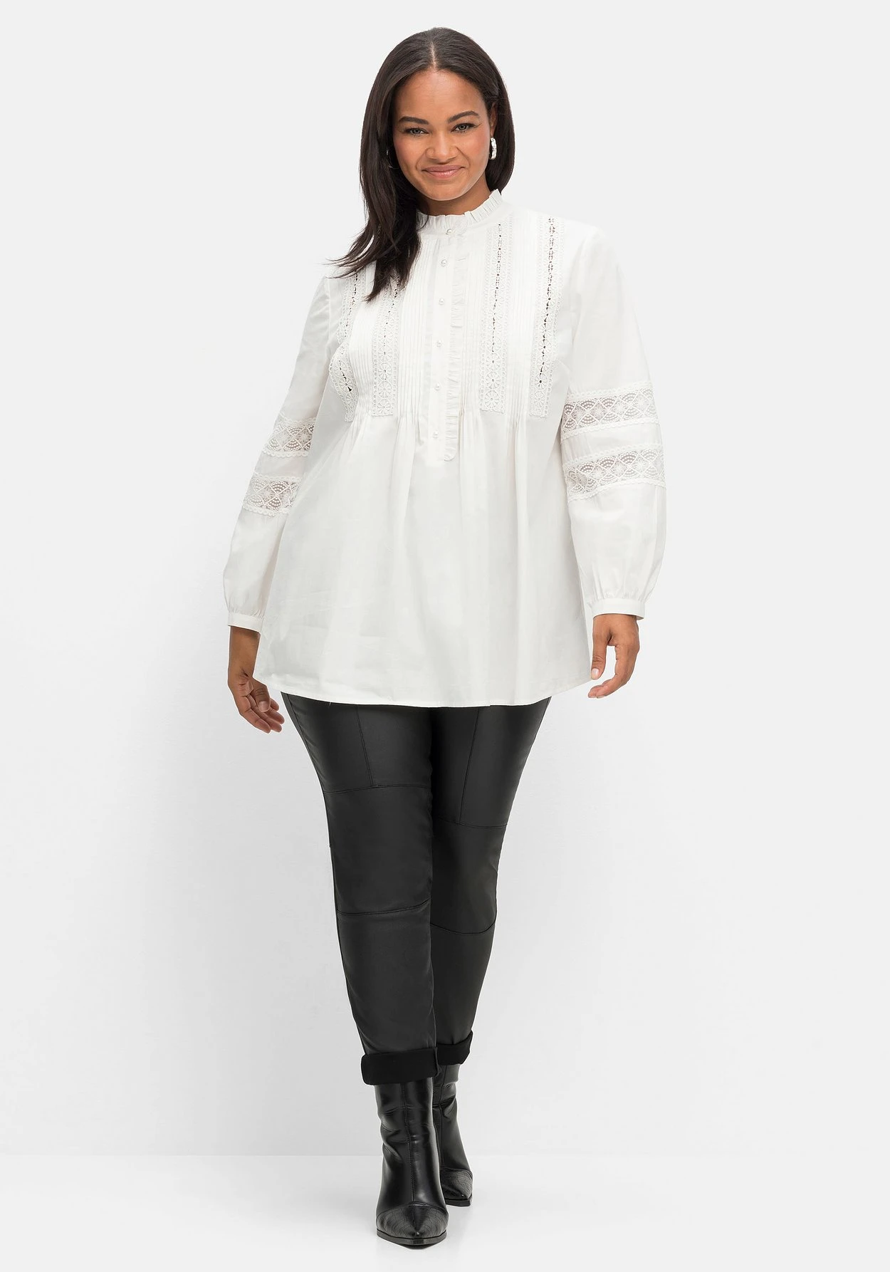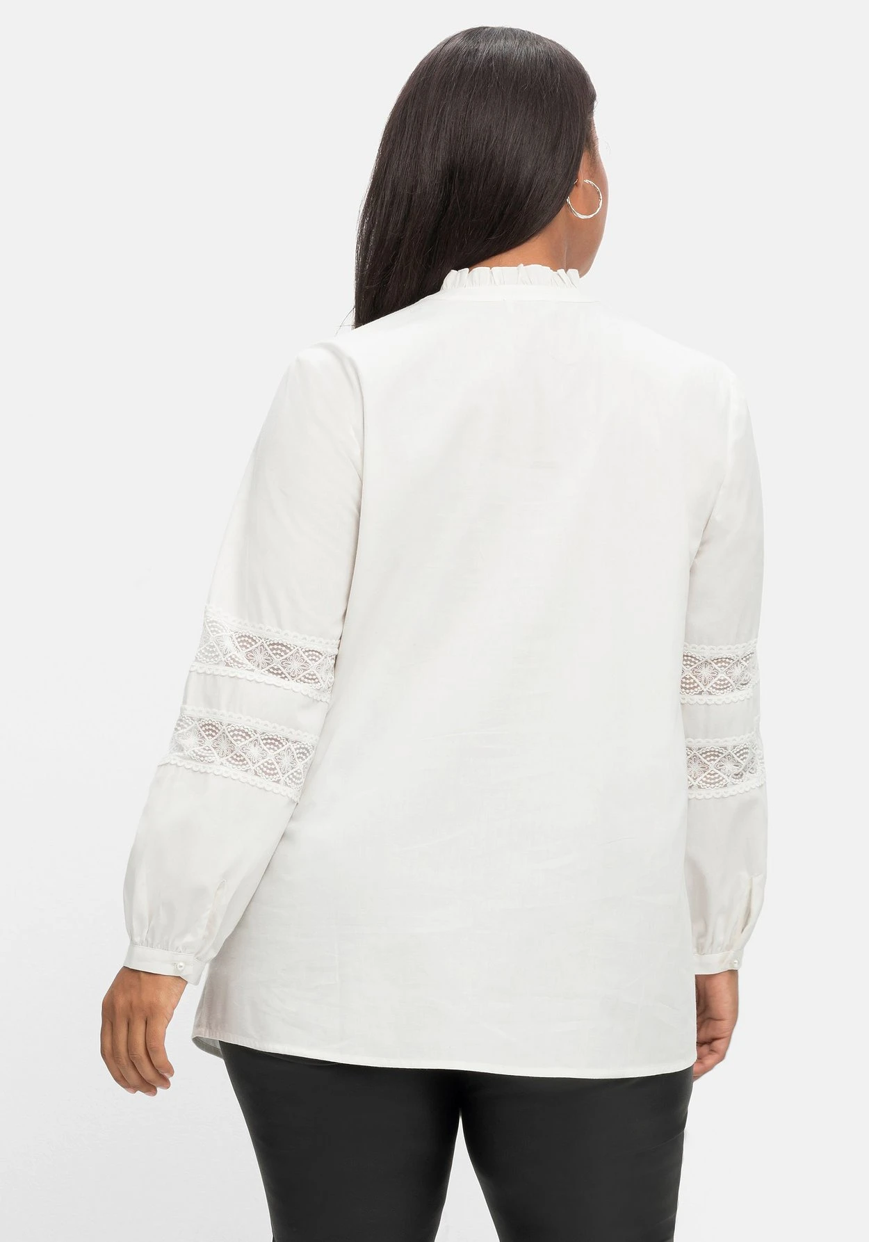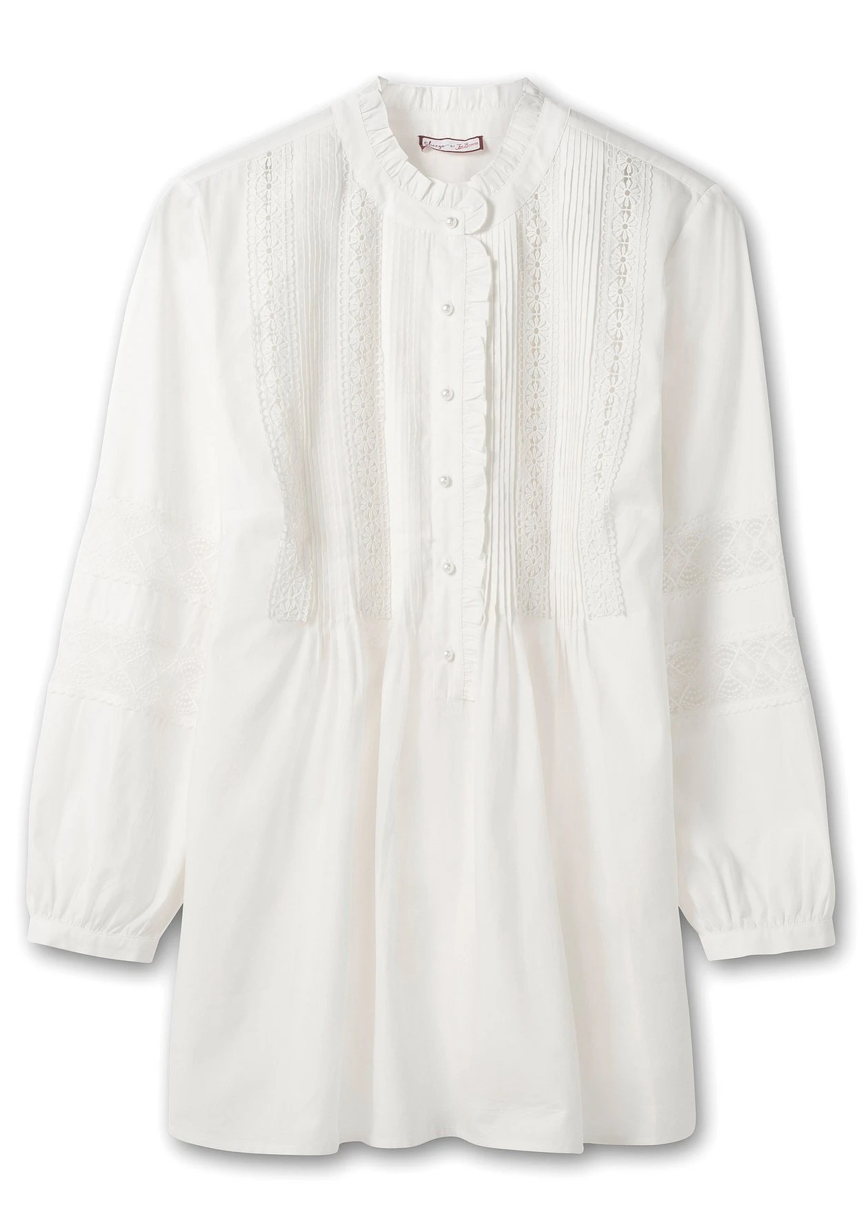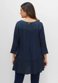 Tunika mit Spitzendetails von sheego by Joe Browns. Der hochgeschlossene Rundhals ist mit einer verspielten Rüsche versehen und lässt sich mit der Knopfleiste bis unter der Brust beliebig weit öffnen. Edel abgerundet wird sie mit schimmernden Knöpfen in Perlmutt-Optik, dekorativen Biesen sowie zarter, floraler Spitze über den Brustbereich. Auch die langen Ärmel sind mit semitransparenten Spitzeneinsätzen versehen und lassen an diesen Stellen fein die Haut durchschimmern. Schmale, angekräuselte Manschetten mit Knopfverschluss ergänzen den femininen Look. Ein kombistarker Partner, der wie gemacht ist für elegante Styles, aber auch lässig-sportiven Look eine feminine Note verleiht.